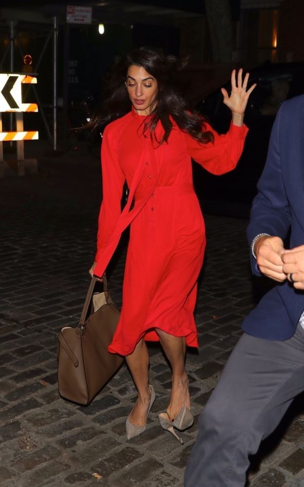 Amal je nosila vatreno crvenu haljinu koja je dopirala do ispod kolena, a na nogama je imala sive salonke, a u rukama je nosila veliku sivu torbu.