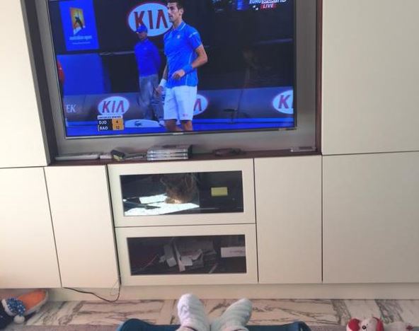 Na fotografiji se vidi kako dečak uživa u svojoj nosiljki ispred televizora na čijem ekranu se vidi Novak u žaru borbe tokom meča.