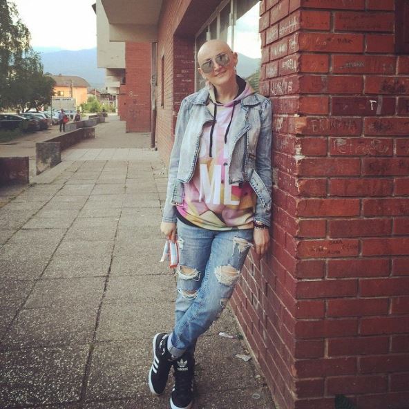 "Gde sam to krenula, a nisam se zalizala! Gde ću bez frizure, imam malu, malenu kosicu, retku, ali slatku, od par milimetara. Danas izložba, pa hemioterapija", napisala je pevačica ispod fotografije.