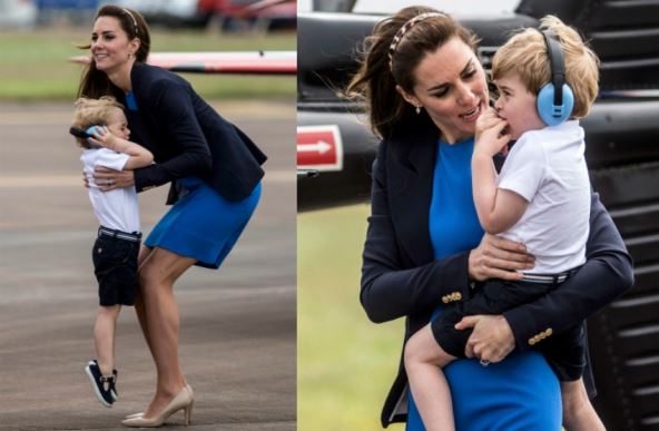 Kejt Midlton mu je na glavicu stavila zaštitne slušalice, brzo ga smirila i vratila mu osmeh na lice, pa su na kraju krenuli da obilaze izložene avione.