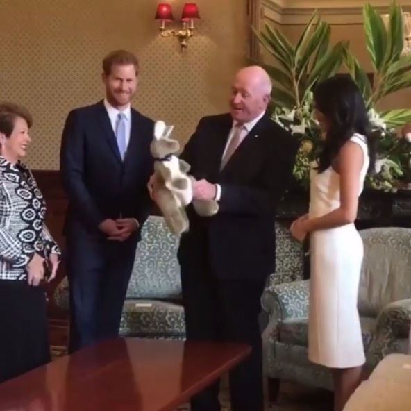 Prilikom sastanka u australijskoj dvorani "Admiral's House" Hari i Megan su od guvernera i njegove supruge dobili plišanog kengura sa bebom u torbi! A uz to i slatke male australijske čizmice. "Prvi poklon za našu bebu!", oduševila se Megan.