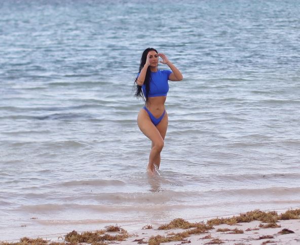 41-godišnja Kim pokazala je svoje poznate obline u plavom topu, koji je ukombinovala s minijaturnim kupaćim kostimom. Iako je naizgled bila bez šminke, slavna rijaliti-sestra ništa nije prepustila slučaju te se dobro pripremila čak i za skok u okean. Pred fotografe je stala poput sirene, a fotografije s odmora na Bahamima već neko vreme deli na svom Instagramu.