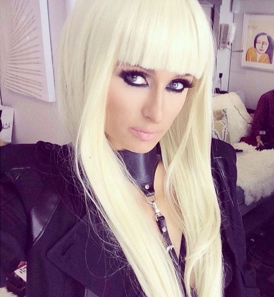 Sa tamno našminkanim očima i žarko crvenim usnama u kombinaciji sa njenom platinasto plavom kosom, u crnom kompletu donjeg veša Paris izgleda poput prave domine.