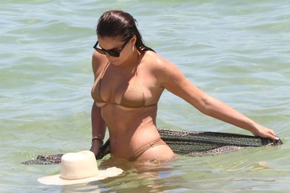 Ova dvadesetpetogodišnja lepotica pokazala je svoje obline u oskudnom zlatnom bikiniju koji je jedva prikrivao njene grudi.