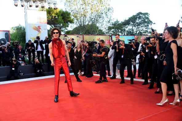 Timoti se sada pojavio na 29. Filmskom festivalu u Veneciji i napravio opštu pometnju. Umesto svečanog odela, glumac je obukao crvene pantalone i maramu koja jednim delom podseća na kravatu. Ipak, kada se okrenuo, fotoreporteri su neumorno škljocali gola leđa, a on je sa zadovoljstvom pozirao sa svojim koleginicama.