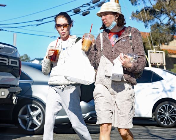 U krem dukserici i helankama, širokoj jakni, s razbarušenim repom i vidno mršava, glumica je nakratko izašla, ali se ubrzo vratila u kuću.