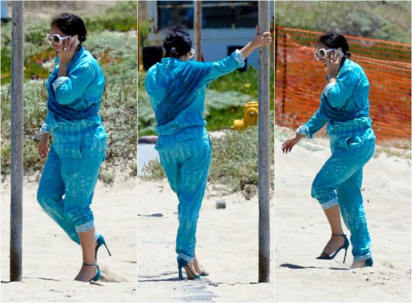 Fotoreporteri su je uslikali kako na plaži razgovara telefonom u nesvakidašnjem izdanju. Naime, pevačica je nosila plavi kombinezon koji je ukombinovala sa visokim štiklama i naočarima sa belim okvirom. Više od pola sata upadala je u pesak i demonstrirala savitljivost svojih stopala, a povremeno se pridržavala za šipku.