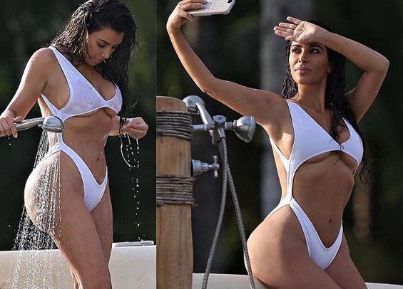 U kratkoj beloj majici i bikini gaćicama, Kim jednostavno ništa nije sakrila. Ponosno se nameštala slikajući selfije, dok je mokra majica oslikavala njene grudi, prenosi Daily Mail.