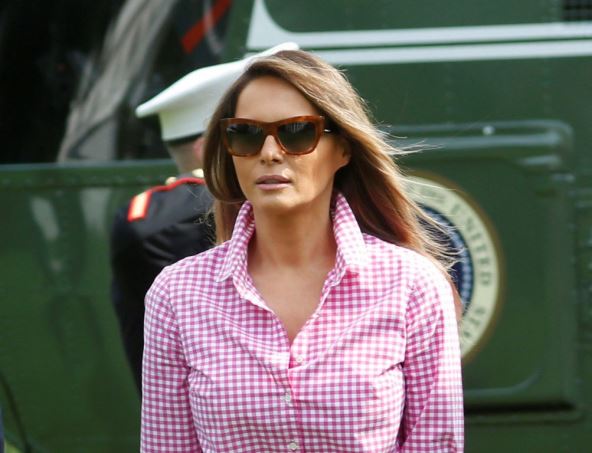 Tačnije, kada su se Trampovi vraćali sa vikend odmora, Melanija se opredelila za uske roze pantalone u koje je uvukla kariranu košulju sa podignutom kragnom.