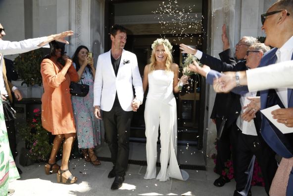 Venčanje je održano u Londonu, u krugu najbližih prijatelja i rodbine. Mlada je nosila beli kombinezon koji je isticao njenu figuru, dok se mladoženja odlučio za crnu odeću i beli sako.