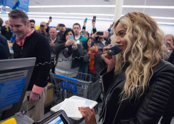 Američka pevačica Bijonse iznenadila je posetioce prodavnice lanca Volmart u Tjuksberiju, u Masačusetsu, gde je svratila u okviru promocije svog najnovijeg albuma "Beyonce".