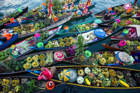 Neverovatna količina čamaca, njih preko 500, koji se "tiskaju" jedan uz drugi, prepuni voća i povrća najživopisnijih boja i tekstura, na kojima lokalne žene iz indonežanskog sela Lok Baitan prodaju svoje proizvode, čini jednu od najvećih plovećih pijaca na svetu.