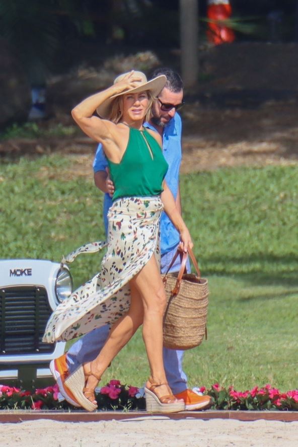 52-godišnja Dženifer Aniston i Adam Sandler snimaju nastavak "Murder Mystery" na Havajima a tom prilikom je Dženifer obukla suknju s dubokim šlicem s prednje strane, koja je istakla njene savršeno oblikovane noge, a sve je uklopila sa zelenom bluzom, ispod koje nije nosila grudnjak. Letnji izgled upotpunila je šeširom i sandalama sa platformama.