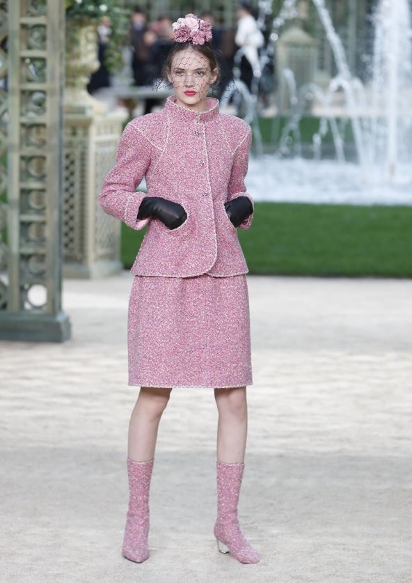Grand Palais pretvoren je u pariški park koji je bio savršena kulisa za večne klasike kuće Šanel interpretirane na moderan način - kostime od tvida, sakoe kraćeg kroja s naglašenim ramenima u roze i tamnozelenoj nijansi.
