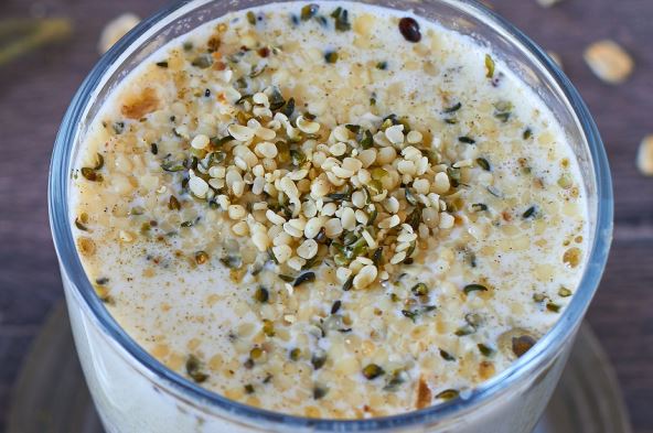 Sastojci: 25 g semenki bundeve, 200 ml bademovog mleka, 2 kašike semenki lana, 1 pomorandža.