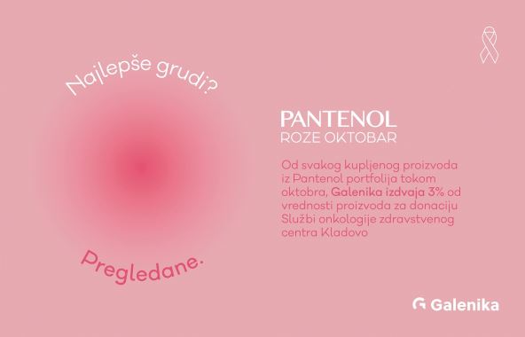 I ove godine, Galenika i njen brend Pantenol preuzimaju aktivnu ulogu u borbi protiv raka dojke, stavljajući zdravlje žena u prvi plan. Tokom oktobra, meseca borbe protiv ove opake bolesti, Galenika već petu godinu zaredom sprovodi donatorsku akciju za zdravstvenu instituciju u Srbiji: od svakog kupljenog proizvoda iz Pantenol linije, Galenika izdvaja 3% vrednosti za ovu humanitarnu inicijativu.