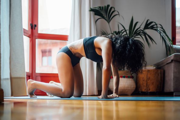 2. Sada se savijte i oslonite se rukama na kolena. Za dodatnu stabilnost, lagano savijte kolena.