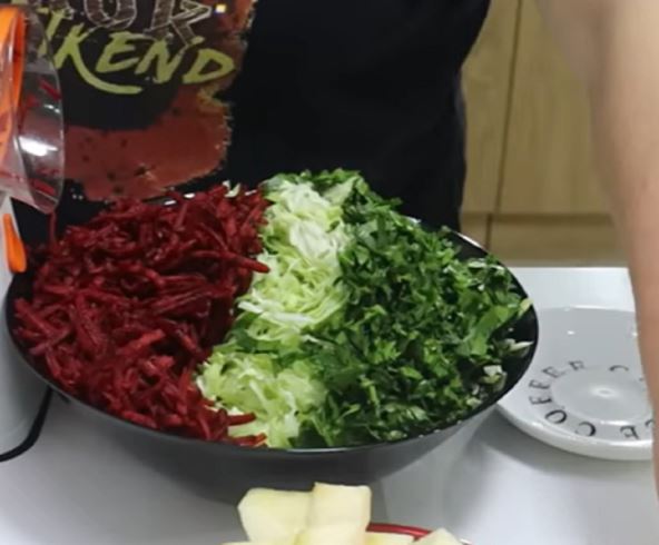 Priprema: Svo povrće i jabuku rendajte ili režite sirovo bez termičke obrade. Sve to stavite u činiju. Uzimajte količinu po potrebi pa koliko možete da pojedete za večeru, začinite sa limunovim sokom, maslinovim uljem i sa soli i biberom. Ovo je veoma zasitna i zdrava salata kojoj niko ne može odoleti.