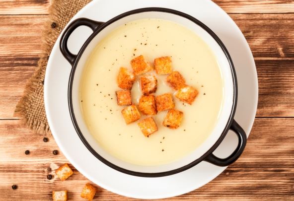 Sastojci: 3 kašike brašna, 3 kašike ulja, 3 dl vode, so po ukusu, beli luk, pržene kockice hleba.