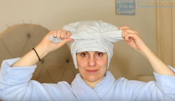 Kada operete kosu, možete je poprskati sprejom za negu, zavisno od vašeg tipa kose. Zatim, uzmite veću majicu i spustite je na krevet. Lagano "složite" kosu na majicu, od vrhova vlasi do temena. Kada potpuno spustite glavu, zamotajte ostatak majice oko glave, poput nekog turbana. Potrudite se da majicu vežete čvrsto, kako bi ostala na glavi tokom noći.
