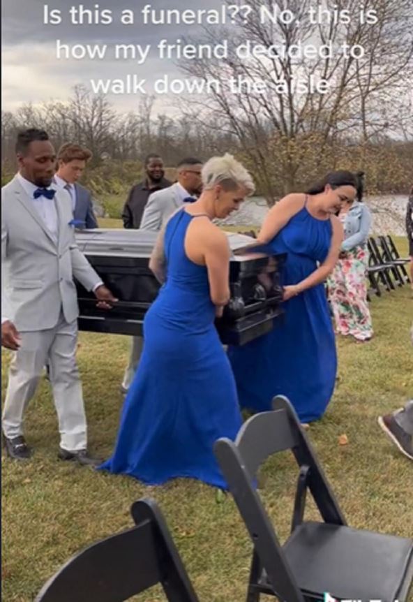 Na snimku koji je osvanuo na TikToku, a prikazuje kako nekolicina ljudi, među kojima su i deveruše, kao i kumovi budućeg bračnog para, iznose crni kovčeg iz vozila, a potom ga odnose pred oltar gde su ga i položili.