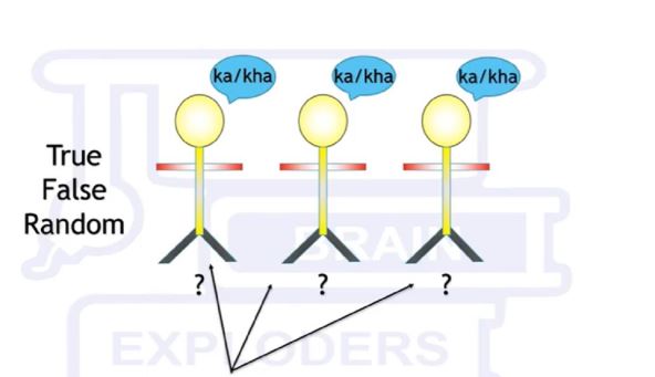 Tri boga - A, B i C, zovu se, po redu, Istina, Laž i Nasumičnost. Istina uvek govori istinu, Laž neistinu, ali Nasumičnost potpuno proizvoljno bira da li će reći istinu ili laž. Vi morate da odredite identitet bogova A, B i C postavljanjem tri pitanja sa DA ili NE odgovorima i svakog boga možete pitati samo jedno pitanje. Bogovi razumeju jezik kojim se služite, ali će vam dati odgovore ne svom jeziku. U njemu se za ‘DA’ i ‘NE’ koriste ‘da’ i ‘ja’, ali vi ne znate šta koja od ove dve reči znači.