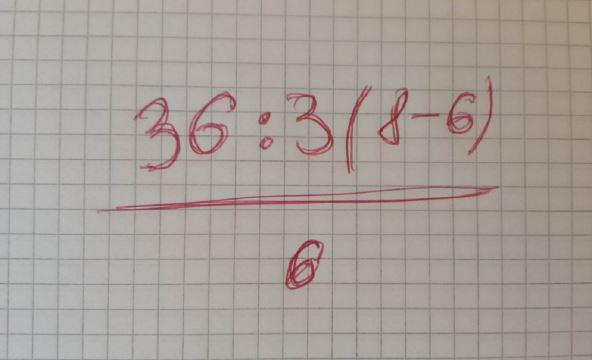 Prvo smo izračunavali ono što se nalazi iznad crte: 36:3(8-6), a pre toga ćemo izračunati razliku unutar zagrade.