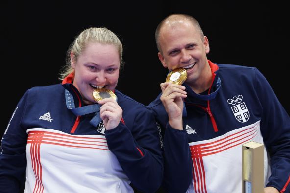 Zorana Arunović i Damir Mikec su do sad Srbiji doneli jedinu zlatnu medalju na Olimpijskim igrama, a nakon dodele su tradicionalno zagrizli svoje medalje.