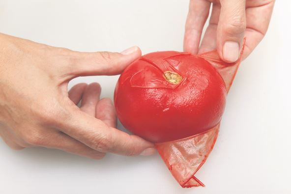 1. Zagrejte vodu u loncu i pustite je da provri. Za to vreme nožem koru paradajza rasecite u X, pa ga stavite u kipuću vodu na 20 sekundi.