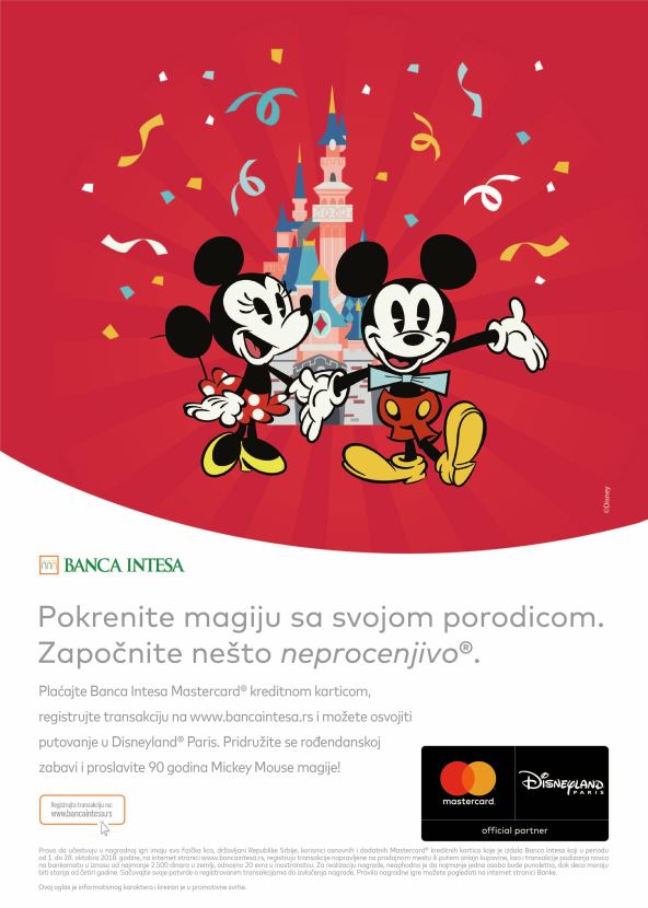 Banca Intesa i Mastercard organizuju svoju sada već tradicionalnu godišnju nagradnu igru u okviru koje korisnici Banca Intesa Mastercard kreditnih kartica mogu da osvoje putovanje u Diznilend u Parizu (Disneyland® Paris). Nagradna igra je otvorena za sve korisnike Banca Intesa Mastercard kreditnih kartica koji u periodu od 01.10. do 28.10.2018. godine svojom karticom plate račun na bilo kom prodajnom mestu, obave transakciju putem internet kupovine ili podignu novac na bankomatu u vrednosti od najmanje 2.500 dinara na teritoriji Srbije, odnosno od minimum 20 evra u inostranstvu.