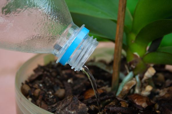 Okrenite flašu naopačke i zabodite je u zemlju u saksiji, pažljivo dalje od korena.