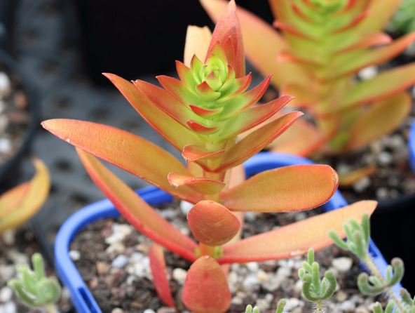 Uski, istureni, složeni mesnati listovi podsećaju na propelere, i tokom rasta menjaju svoju boju od zelene do jarkocrvene. Sitni, zvezdasti, beli cvetovi se pojavljuju na granama u toku leta.