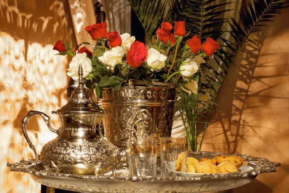 Tipičan marokanski čajni set se sastoji od posrebrenog, fino izgraviranog poslužavnika, srebrnog čajnika, sukrijere i posude za mleko. Neizostavne su raznobojne male čase ručno oslikane i posuda od bakelita ili metala sa mesinganim aplikacijama u kojoj se drže arome koje daju specifičan ukus čaju. Za prave hedoniste tu je i šiša za aromatične duvane. Dodajte i tabure i imate pravi mali marokanski čajni kutak u vašem domu.