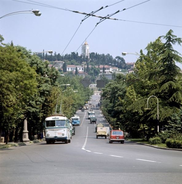 Prolazimo pored Masandrovskog dvorca, omladinskog kampa „Artek“ i Botaničke bašte, i svuda izlaze i ulaze turisti. Mnogi nose fotoaparate i naočare za sunce. Sa leve strane kroz prozor trolejbusa vidimo krimske gradiće i dole veliko i sjajno more. Sa desne strane su vinogradi i rezidencije njihovih vlasnika.