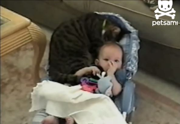 Iako je mačka zauzela veliki deo bebine ljuljaške, beba se ne buni, već mazi svoju ljubimicu.
