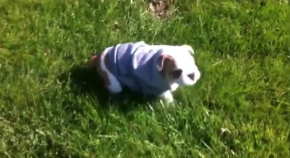 Svako sebi nađe zabavu, pa tako i ovaj maleni engleski buldog. Kučence po imenu Sofi uživa u kotrljanju po svežoj travi niz brdašce.