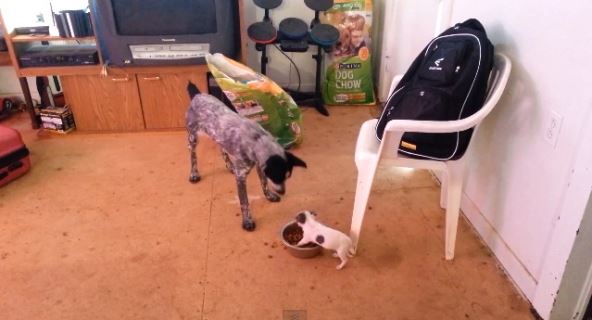 Psić Sejdi bio je čvrsto rešen da zaštiti svoju činiju hrane od drugog psa Foksija koji je otprilike pet puta veći od njega.