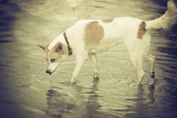 Naime, pas je u sred poplavljene ulice prednjim šapama gurao vlasnikova kolica, pomažući mu da se izvuče iz vode.