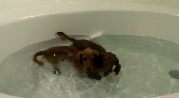 Psi su odlični plivači, ali ovim malim jazavičarima je voda omiljena sredina, sudeći po ovom snimku.