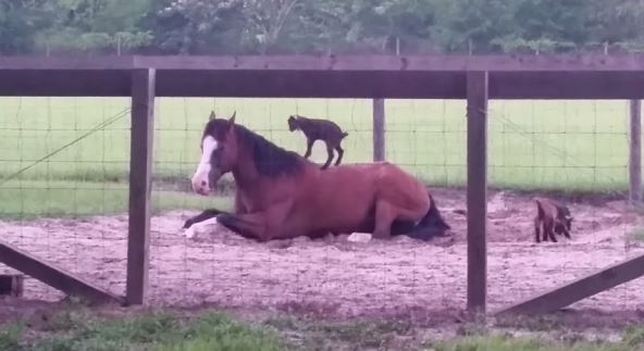 Maleno jare padalo je sa konja non-stop, ali ga to nije omelo u nestašlucima i skakutanju. Kada su i drugi jarići uvideli kolika je to zabava, i oni su počeli da koriste konja kao trampolinu