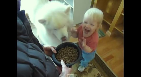 Činija sa hranom i prazan stomak - idealna kombinacija. Dvogodišnji dečak, koji jedva da je viši od svog četvoronožnog belog drugara, odlučio je da ga nahrani.