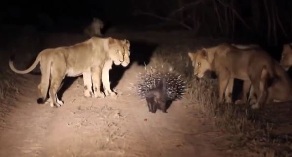 Shvativši da je u smrtnoj opasnosti, bodljikavo prase se nakostrešilo i zauzelo odbrambeni stav protiv 17 gladnih lavova. Potom je počeo da maše repom, a divlje mačke su nakon nekoliko minuta shvatile da od ovog plena nema ništa