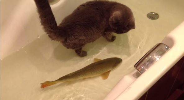 Mački ne samo da ne smeta da stoji u kadi sa vodom, već joj društvo pravi riba, koju ni ne pokušava da pojede, što bi bilo za očekivati.