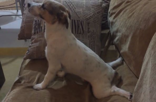 Pas je odmah poskočio, odvojio pogled od televizora i uskočio među jastuke!