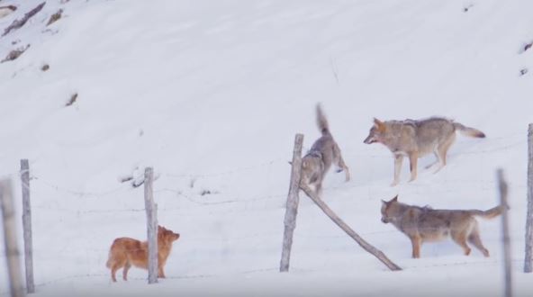 Ovaj neverovatan snimak nastao je u Italiji. Tri mlada vuka su napala psa i činilo se pas nema nikakve šense da preživi.