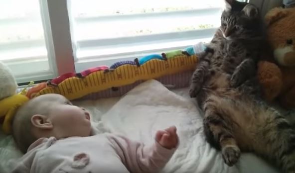 Maca je izgledala potpuno zbunjeno nakon što se probudila pored bebe. Iako je ljubimica potpuno miroljubiva, gledala je u bebu sa čuđenjem, a već sledećeg trenutka nije znala šta ju je snašlo.