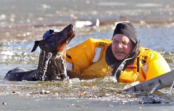 Pas Diablo se nesrećnim slučajem našao u ledenom jezeru u kojem je ostao 25 minuta dok spasioci nisu došli i pomogli da izađe na suvo