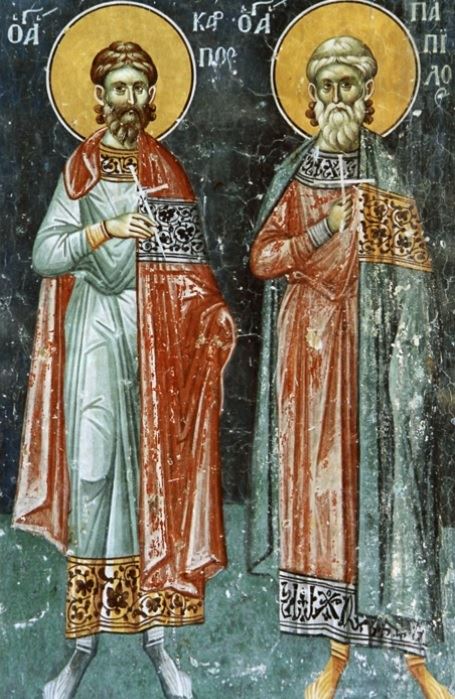 Sveti mučenici Karp i Papila. Karp beše episkop Tijatirski a Papila đakon. Rodom behu iz Pergama, gde najzad i postradaše za veru Hristovu od opakog namesnika Valerija, a u vreme carovanja Dekijeva. Veza ih Valerije za konje i otera u Sard, gde ih baci na ljute muke, no angel Božji javi im se, isceli ih od rana i ukrepi.