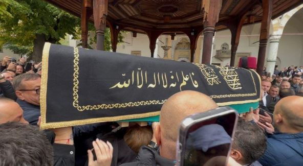 Sanduk sa telom pevača Halida Bešlića bilo je prekriveno pokrivačem ili ćefinom na kojem je arapskim pismom ispisano: