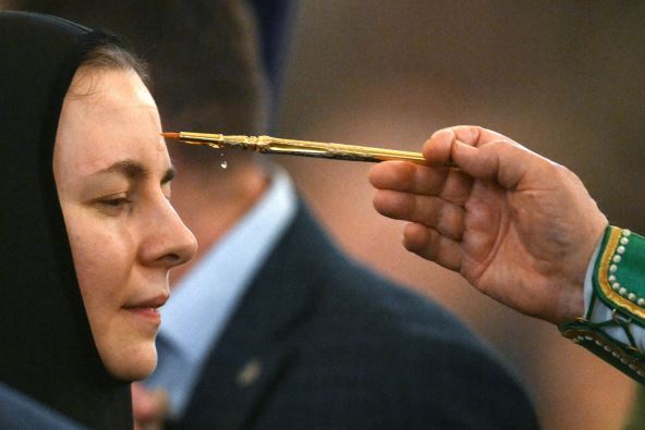 Pre potapanja u kupelju tokom Tajne Krštenja, vrši se i pomazanje uljem, koje se pre toga osvećuje čitanjem posebne molitve, koja govori o ulju kao simbolu čovekovog pomirenja sa Bogom.